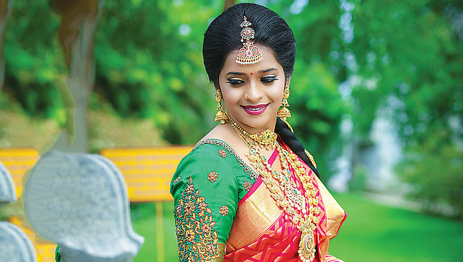 சேலைகளுக்கு ஏற்ற நகைகளும், அதற்கேற்ற ஆக்ஸசரீஸும் எடுப்பதில் தான் ஒரு மணப்பெண்ணின் மொத்த தோற்றமும் அடங்கி இருக்கிறது.